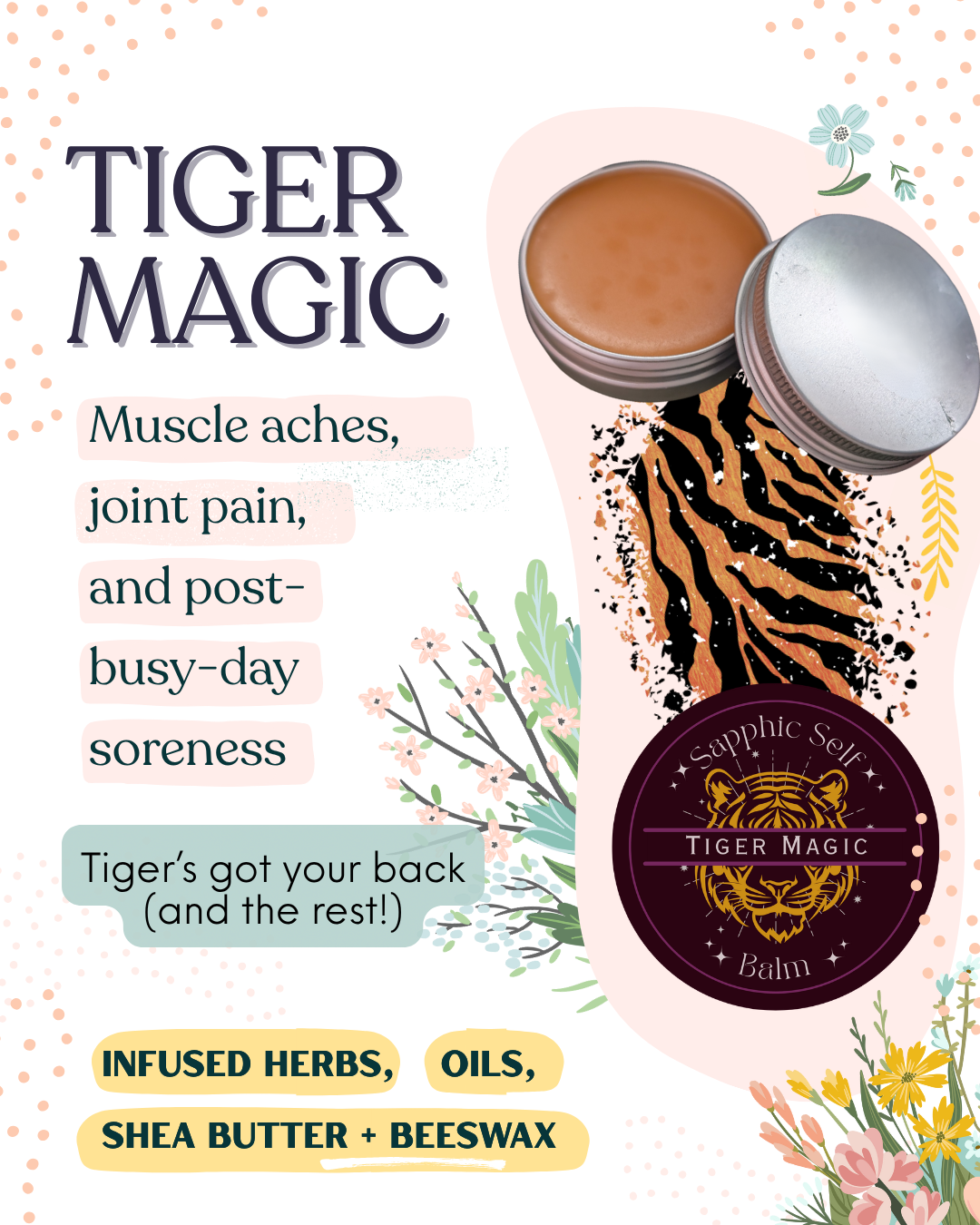 🐅 Tiger Magic Balm & Massage Bar — gentle heat and circulation support for tight muscles and cramps.